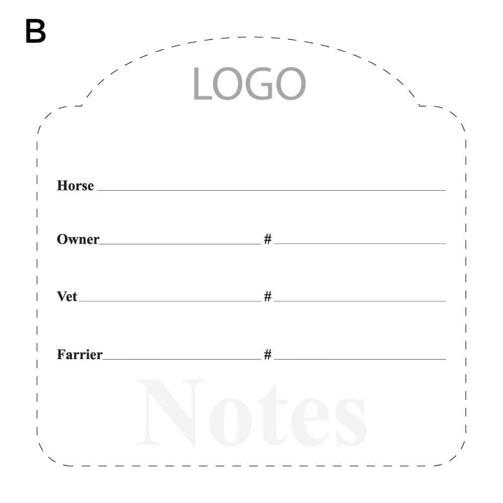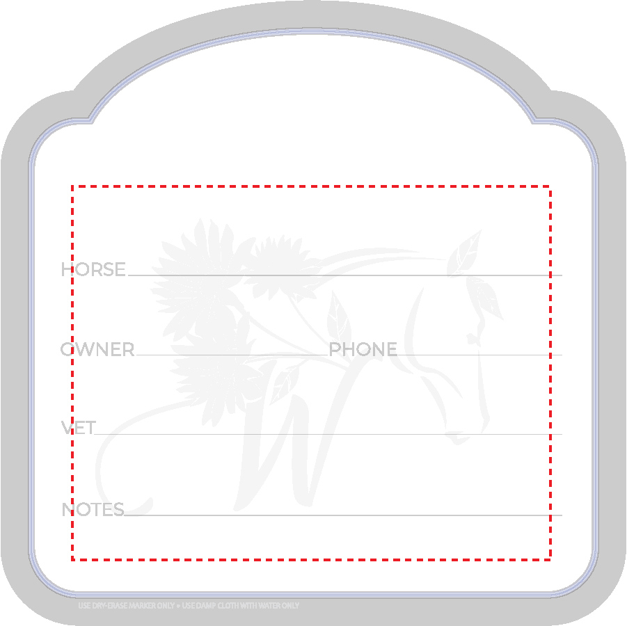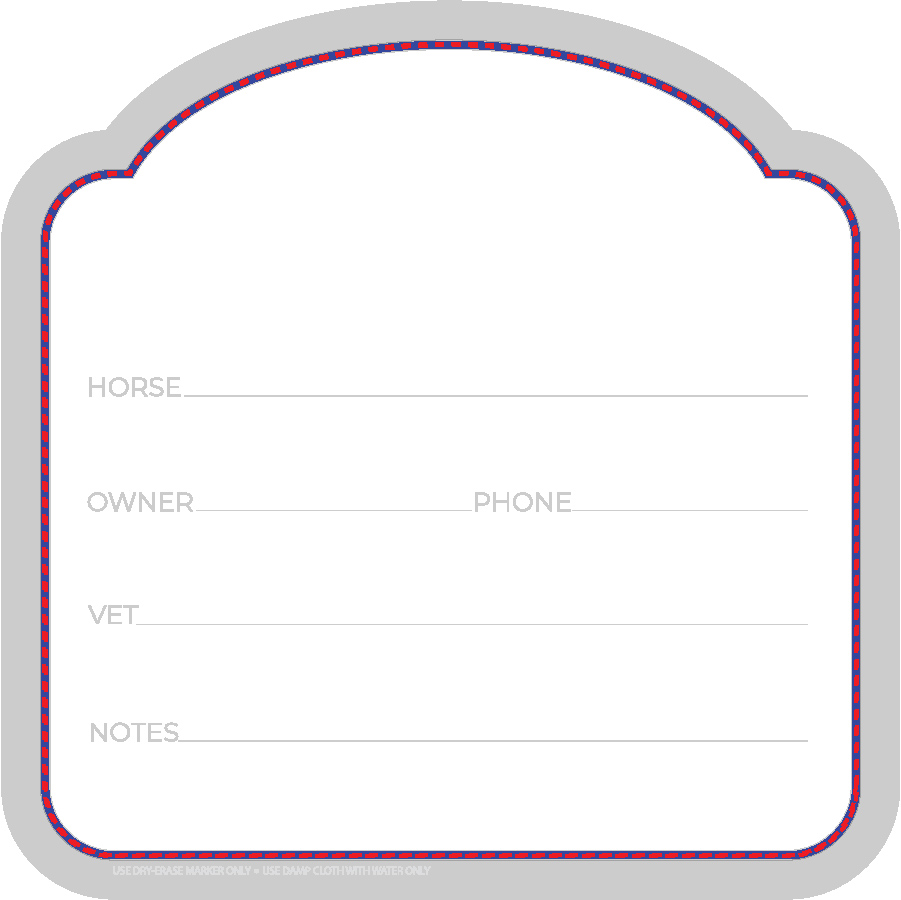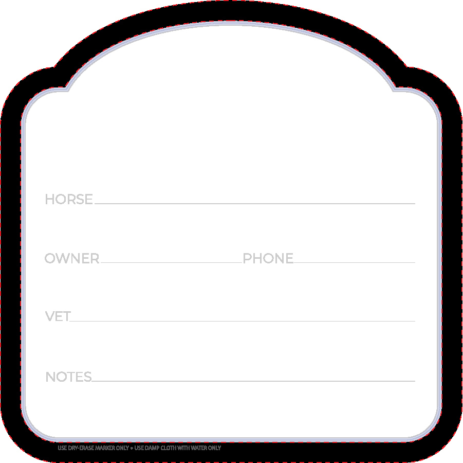 SP RHODES stable whiteboards can be customized to suit your barn branding. We use a durable, waterproof commercial-grade materials for our reusable products. Quality surfaces support using either dry-erase or wet-erase markers (read about the difference in our specifications section).  We use brand-name substrates rather than cheaper substitutes to meet the needs of hard barn environments (extreme humidity, cold, heat). A UV coating, vibrant colors, quality 3M overlay and durable WeatherPlex surfaces make SP RHODES whiteboards your #1 choice for custom dry-erase/wet-erase reusable stall signs.
