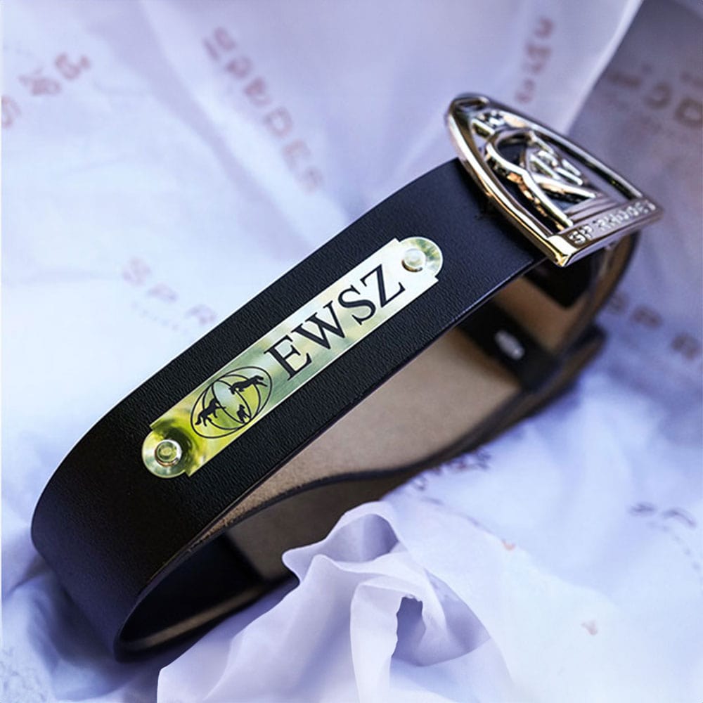 Add a custom nameplate to this genuine leather equestrian belt. Silver buckles will come with silver nameplates; antique gold buckles will come with brass nameplates. Nameplate will be placed on the right side of your belt between approximately the second and third belt loops of your breeches. This is the ultimate team gift.