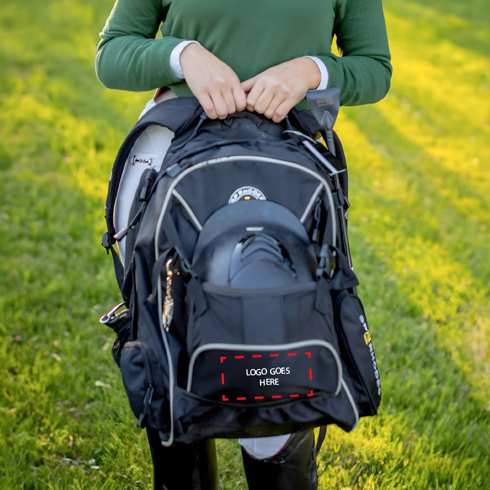 The SP RHODES Customizable Ring Bag is designed to suit both riders and grooms. You have the option to add your logo to the removable front flap. A waterproof exterior made with 600D nylon means it will endure many trips back and forth to the ring. Complete with a removable helmet sling, this ring bag can transition easily from an equestrian essential to a daily necessity. Multiple interior compartments with heavy-duty zippers allow for separation of your riding boots from your laptop. An interior mesh wall allows for breathability. A padded back with adjustable padded comfort straps distributes weight evenly.