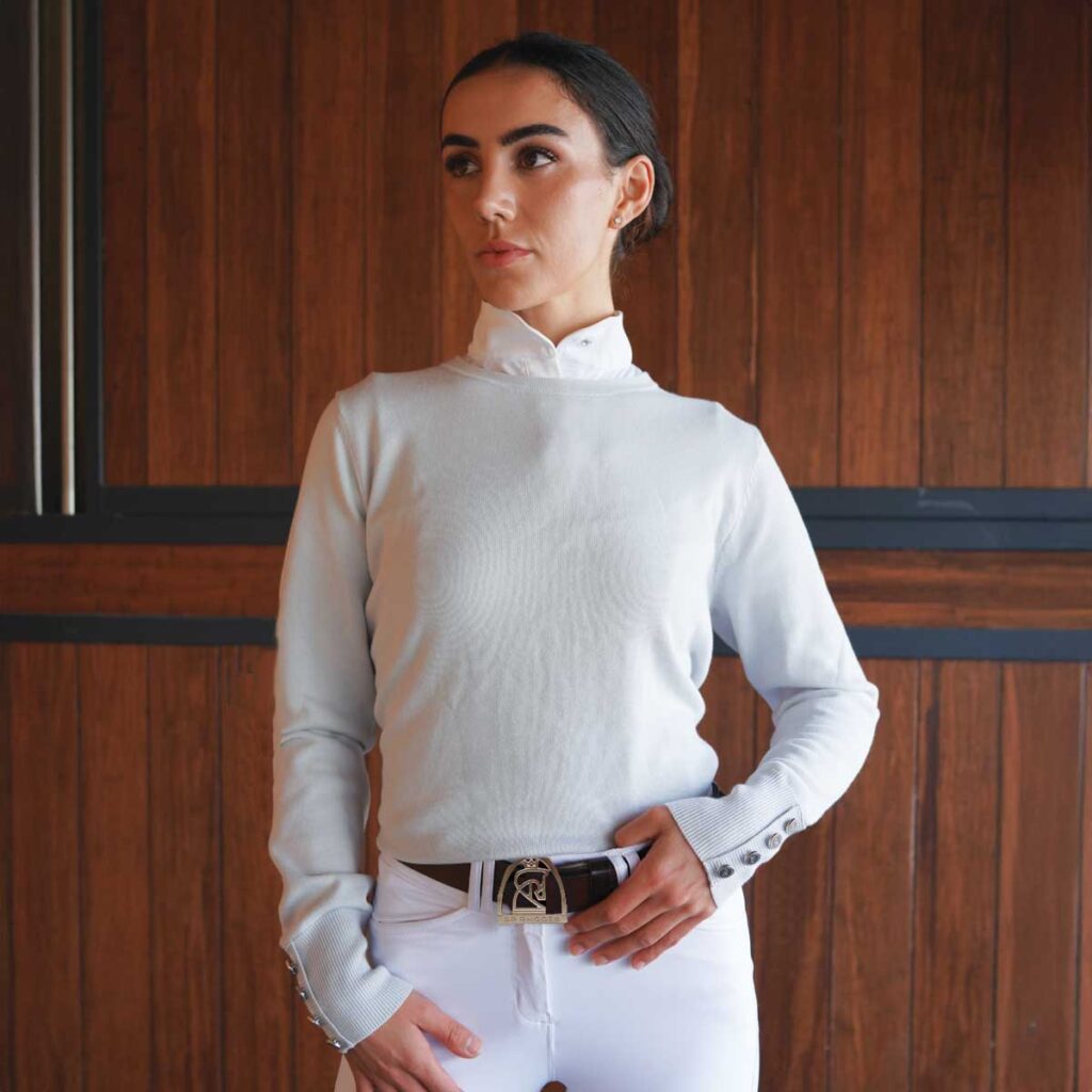 The perfect equestrian sweater for over your show shirts. Tidy looking, preppy and customizable with your equestrian logo. This crew neck equestrian sweater is made to be stretchy, breathable, machine washable and fade-resistant. Instantly take your horse show outfit from athletic to chic.